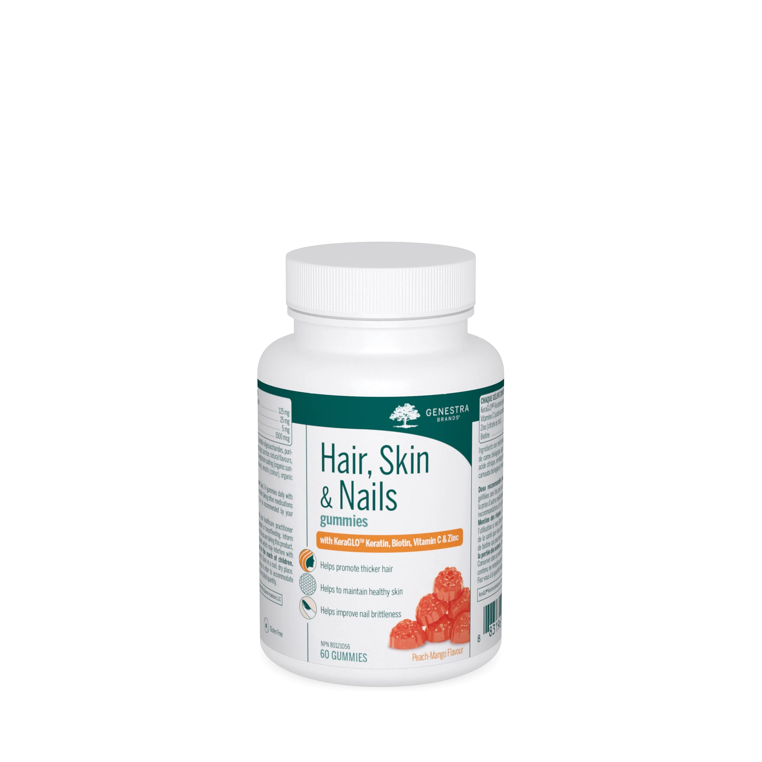 Les gélifiés Hair, Skin & Nails Gummies contiennent de la kératine hydrolysée KeraGLO™, de la biotine, de la vitamine C et du zinc pour aider à améliorer la qualité générale des cheveux, de la peau et des ongles. La kératine hydrolysée favorise la croissance et la prolifération des kératinocytes, stimulant ainsi la production de kératine dans les cheveux, la peau et les ongles. Les études cliniques sur la kératine montrent une amélioration de la brillance, de la fragilité et de l'enchevêtrement des cheveux et une amélioration de la fragilité, de la douceur et de l'aspect terne des ongles après 90 jours1-3. La biotine est une vitamine B (B7) et un coenzyme pour les enzymes carboxylases qui sont importantes pour de multiples voies métaboliques. Ces rôles rendent la biotine particulièrement importante pour la formation de nouveaux tissus, en particulier les tissus cutanés qui ont un taux de renouvellement élevé. La vitamine C a de nombreuses fonctions biologiques, mais ses rôles en tant qu'antioxydant et dans la formation du collagène sont essentiels au maintien de la santé de la peau. Le zinc est un oligo-élément important dans l'organisme et est utilisé depuis des siècles pour soutenir la santé dermatologique. Il agit comme cofacteur pour plus de 300 enzymes impliquées dans divers processus biologiques, tels que la réplication de l'ADN dans la peau, la stabilité des membranes, la formation des os et la santé de la peau. Les gélifiés Hair, Skin & Nails Gummies sont de délicieux gélifiés naturels aromatisés à la pêche et à la mangue, sans arômes ni colorants artificiels, avec moins de 0,5 g de sucres totaux par gélifié. Cette formulation contribue à améliorer la santé générale des cheveux, de la peau et des ongles dans un format idéal pour les personnes qui ont des difficultés à avaler des gélules ou qui n'aiment pas le faire. Il suffit de prendre 2 à 4 gélifiés par jour au cours d'un repas pour en constater les bienfaits.