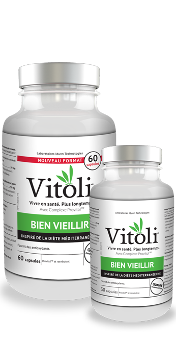 Les études scientifiques sur les polyphénols d’olive et le resvératrol ont démontré des effets positifs sur un très grand nombre de problèmes de santé liés au vieillissement (Cicerela et al, 2010; Hu et al, 2014; Tomé-Carneiro et al, 2013). Pour vieillir en santé, il est recommandé de prendre VitoliMD BIEN VIEILLIR de façon continue afin de réduire les niveaux d’oxydation et de maintenir une défense antioxydante naturelle. Il fut démontré qu’en plus d’avoir une capacité antioxydante très importante, les polyphénols d’olive du Complexe ProvitolMD et le resvératrol augmentent spécifiquement l’action des enzymes naturelles antioxydantes du corps humain (Hu et al, 2014; Timer et al, 2012). Ils sont aussi connus pour leurs effets sur le vieillissement (Samo Ribaric, 2012; Menendez et al, 2013). Attention : les antioxydants ne sont pas tous équivalents; ceux de VitoliMD BIEN VIEILLIR ont été sélectionnés et formulés en fonction des études scientifiques récentes.