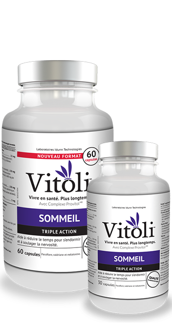 Si vous souffrez d’insomnie, si vous avez de la difficulté à vous endormir ou encore, si vous devez vous adapter à des changements d’horaires tels que les décalages dus aux voyages ou au travail, il est recommandé de prendre VitoliMD SOMMEIL. Les bénéfices devraient être ressentis dès la première nuit, avec des résultats optimaux après deux semaines. Les problèmes de sommeil peuvent se manifester de plusieurs façons et causer de l’irritabilité, des problèmes de concentration et de mémoire, des troubles digestifs, de la tension artérielle, une baisse du système immunitaire et/ou la dépression (Cribbet et al, 2014; Campos Costa et al, 2013).